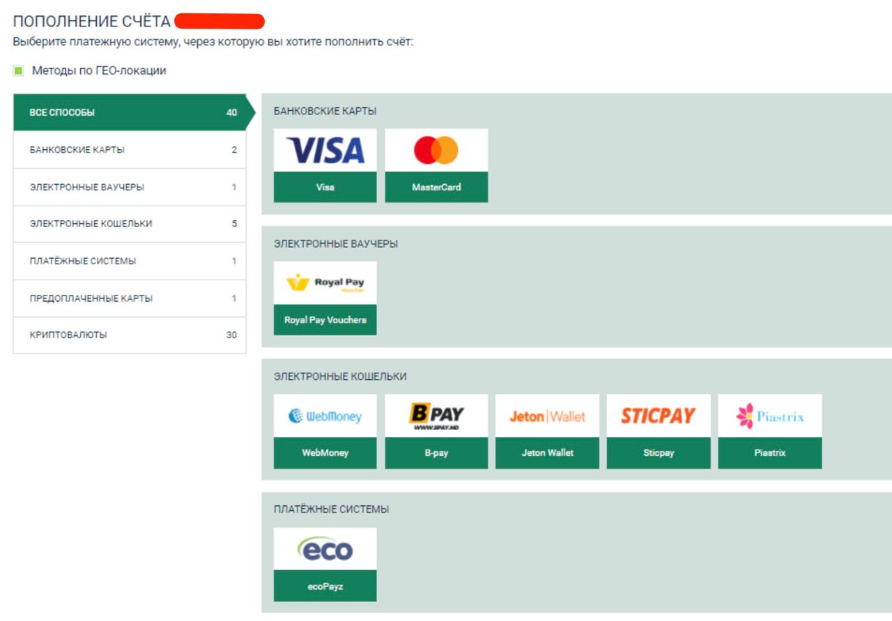 Среди доступных способов: платёжная система ecoPayz для международных переводов, несколько популярных электронных кошельков, терминалы оплаты для внесения наличных, банковские карты основных платёжных систем. Каждый метод имеет свои особенности по срокам зачисления и минимальным суммам операций.